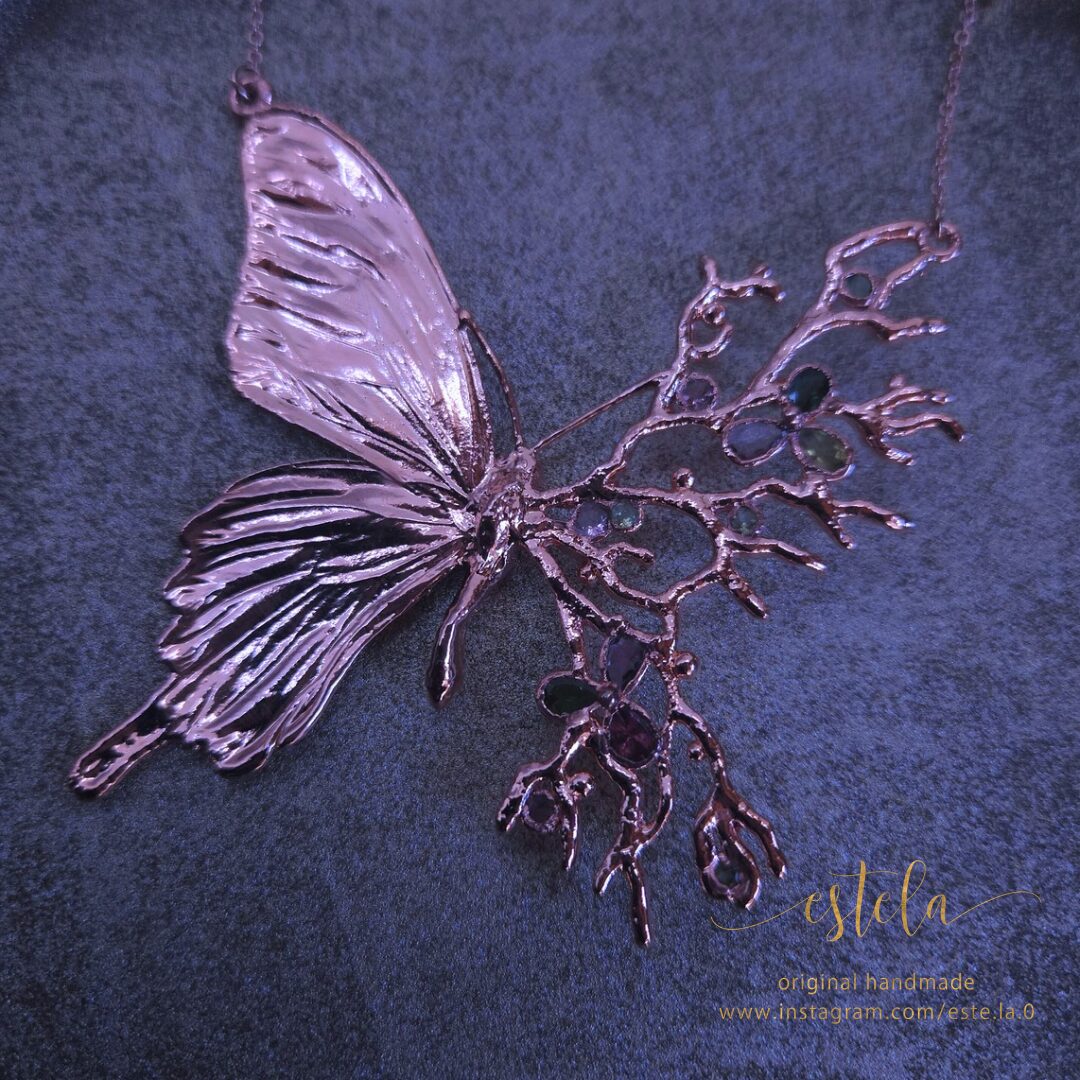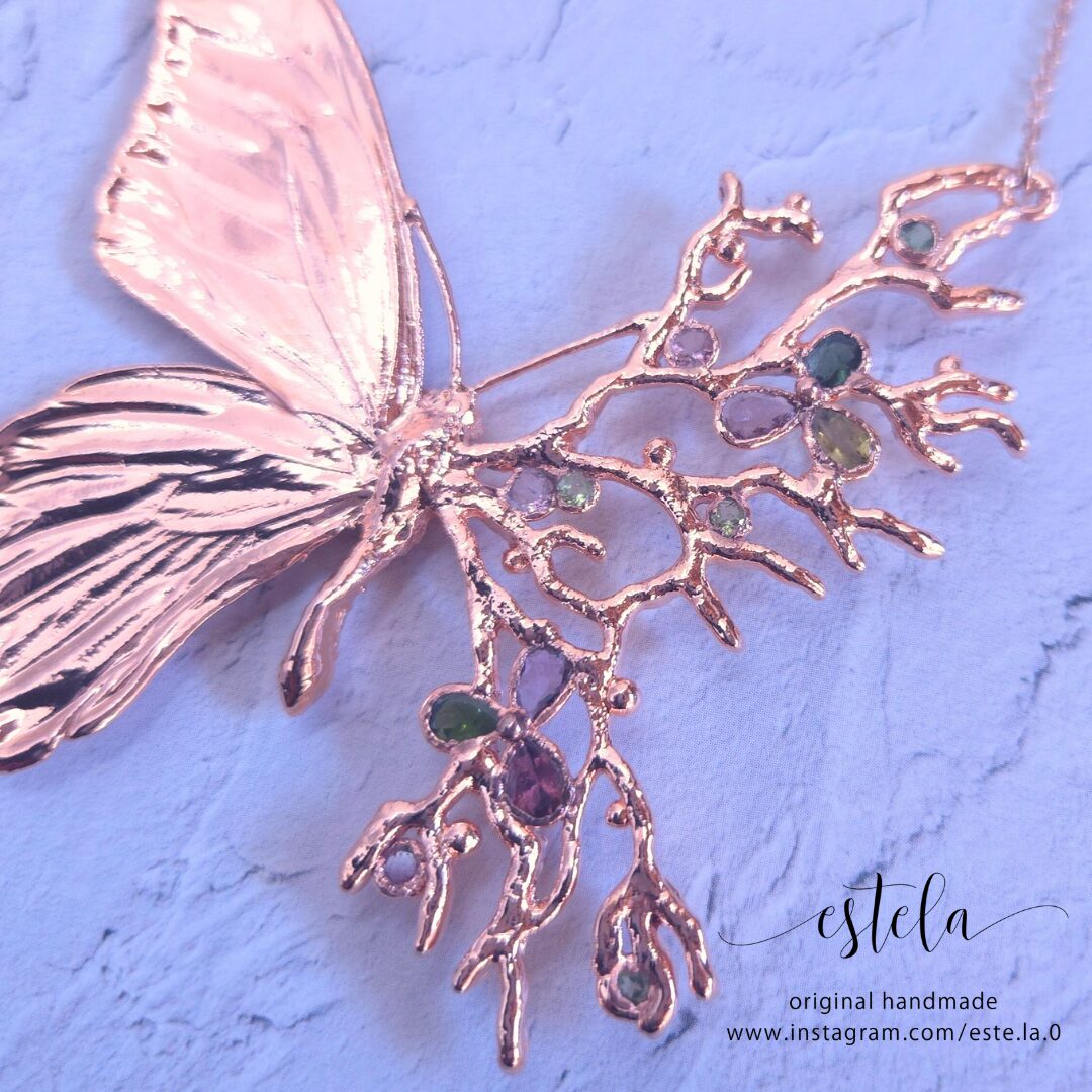 片翼のキアゲハと、繊細に伸びる樹の枝がひとつになった、 エレクトロフォーミングならではの存在感あふれるネックレスです。