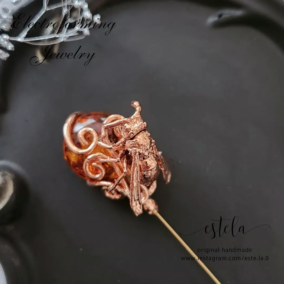 電鋳(エレクトロフォーミング)は、金属イオンを素材に電着させて形状を作製する手法で、本物の植物や木の実などをそのままの形で銅メッキを施せる技術です。